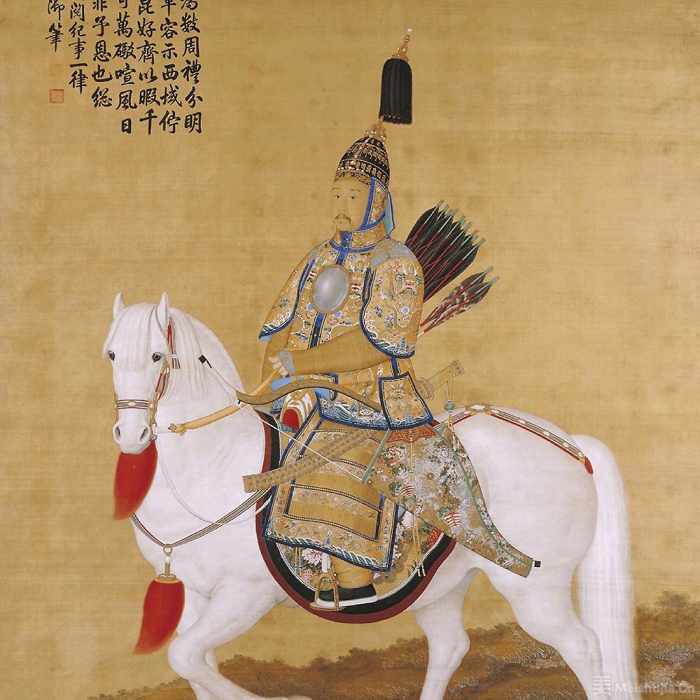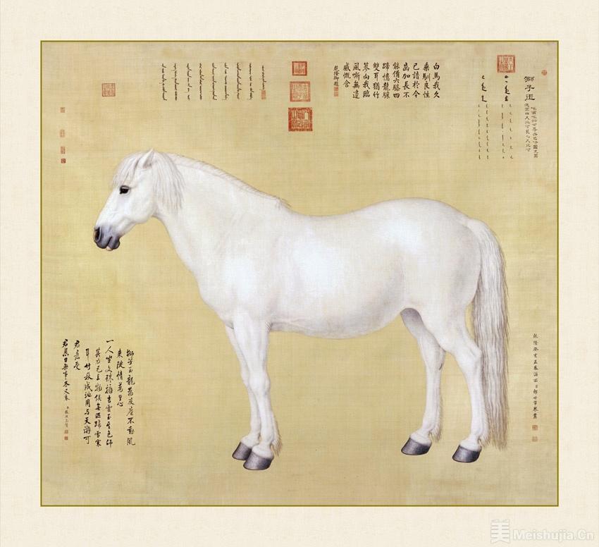 清以弓馬奪天下,故歷代皇帝對騎射十分重視。本次展覽中可以看到多件清代宮廷畫家作品,例如王致誠《十駿馬圖》、郎世寧《獅子玉》《乾隆帝盔甲乘馬圖》等?!丢{子玉》描繪了藏傳佛教格魯派活佛進貢給乾隆皇帝的駿馬,因其通體雪白,故取名「獅子玉」。此畫收錄于《石渠寶笈初編》。