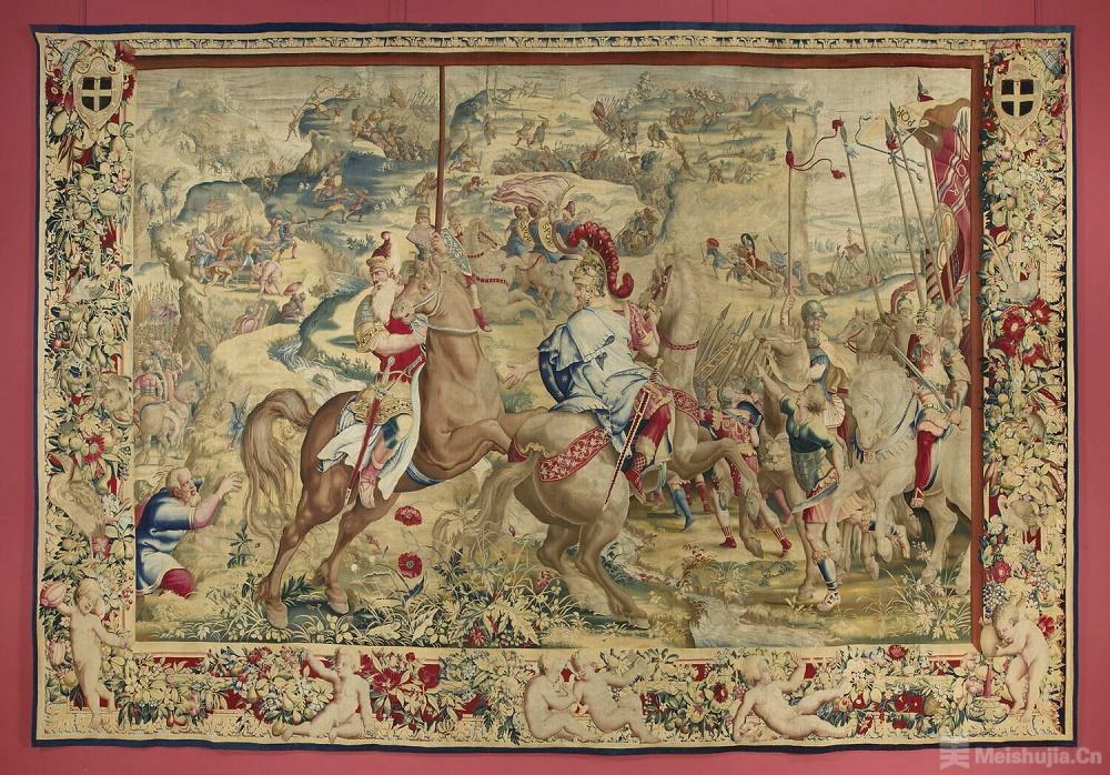 盧浮宮借展文物中最值得關注的是「西庇阿高原交戰掛氈」,這是一件制作于17世紀的低經紗密度編織掛氈,采用羊毛經線、羊毛及絲綢緯紗編織而成,高4.46米,寬6.28米,重約45公斤,描繪了羅馬軍隊騎著戰馬在山坡上作戰的場景。
