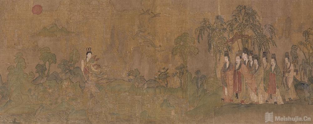 本品一般被認為是北宋摹本,屬存世《洛神賦圖》中年代較早的佳作。作品不書賦文,以連續的構圖描繪了曹植與洛神從邂逅到分離的多幕情景。畫面敷色濃艷,用筆如春蠶吐絲般細勁綿延,人物幾乎與山、樹等大,體現出古樸稚拙的六朝繪畫遺韻。