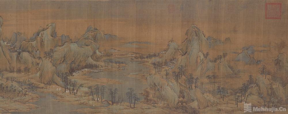 此卷畫風及結構甚為精妙,全幅以大青綠為主調,繪崇山峻嶺、江河溪澗。山石以線條勾勒輪廓,再用「小斧劈皴」表現深度及質感,最后以石青、石綠、赭石等賦色。作品布局宏大、雄渾壯闊,有北宋山水之氣派;又意境幽雅秀逸、著色艷而不俗,具文人畫之古雅與寫意特征。
