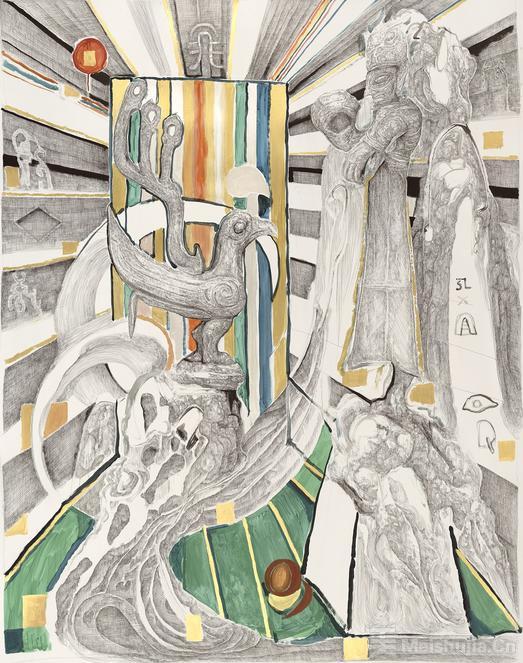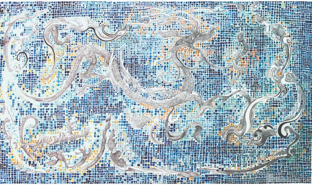 在林國成的「山水系列」中,有形與無形的界限模糊,引至山水、市景、夢境的和諧交融。這三位一體的境界為觀眾提供了多維的體驗,自然的寧靜、人造結構的活力和夢幻世界相互匯聚在一起。在《雪月蒼》中,林氏將中國傳統山水畫煉化,以都市元素和夢幻為特色,在長方形的框架內描繪了雪景和中國傳統的小屋,而在《變體岸溪圖》中,藝術家通過運用複雜的素描技巧,構築了廣闊的河岸與人造結構的寧靜形象。他用盤繞的線條和斷續的留空,描繪了雪、雲和霧。這些雪、雲和霧在畫面範圍內擴展並超出了所被放置的框架的限制,創造了一種可能在夢中僅有的空靈與物質的衝突感。