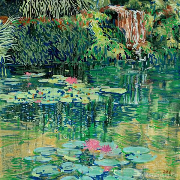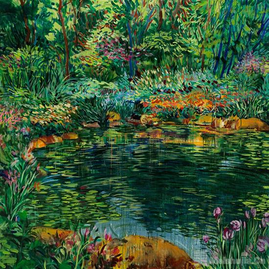 例如在最新的《棲息地》系列中,背景所描繪的叢林和花卉,使用大膽的熒光色系,既是對自然原貌的超脫,更是對當代社會外部環境復雜性、多樣性、迷惑性的直觀體驗,同時也敏銳地洞察著在其中“棲息”的動物——以靈動的兔子形象,暗喻在動與靜之間飽含的生命張力和生存智慧。讓觀眾在她建構的繪畫敘事中,重新體驗那些日常生活中最寶貴的情緒價值;而《趣途-小池》系列,既是平靜美好、繁花盛開的景象,又在倒影的漣漪中注入變幻莫測的遐想;在《浪》系列中,洶涌的浪潮既是自然之力,也是時代席卷的隱喻……她的作品,像一幕幕緩緩展開的故事,通過構圖、色彩和節奏,營造出強烈的情緒磁場,將個體困惑、群體焦慮與時代浪潮壓縮為視覺的共振,邀請觀眾進入她的藝術敘事中,調動自身的感知。畫面因此成為連接個體與集體、內在與外在的情緒界面。
