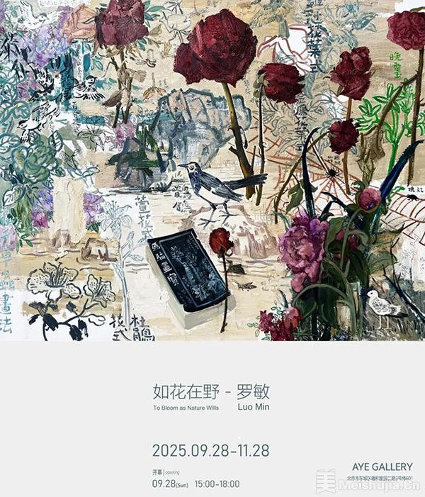 AYE 畫廊將于9月28日至11月28日舉辦藝術家羅敏的個展“如花在野”。羅敏以表現主義的繪畫手法重新演繹花鳥主題,既吸收了傳統繪畫中關于花卉與禽鳥的線條感、留白與詩性意境,又借鑒了西方繪畫的厚涂肌理、色彩沖擊與結構性光感。畫面中既有懸浮的離叢玫瑰,花枝底部斜切,似靜物被釋歸自然;也有中國線描花卉、鳥雀與蛛網的細膩描繪,打破透視秩序?!度缁ㄔ谝啊凡粌H是一次跨文化的圖像實驗,也是對“圖像何以為生”的再追問。在自然與觀念、傳統與當代之間,羅敏讓花鳥成為文化互文的符號,同時也是觀看方式變革的見證者。