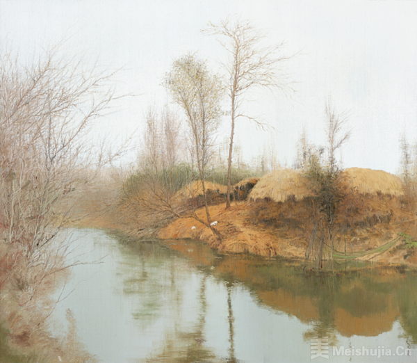 在風景創作中,他的視野從蘇北故里延伸至廣袤中國:田壟水洼的春綠、覆雪村落的冬白,是鄉愁的具象化;異鄉山野的晨霧、戈壁的落日,則是對自然多樣性的詩意回應。他筆下的風景從非“復刻自然”,而是“心象的投射”——光影是情緒的注腳,季節流轉是時代變遷的隱喻,那些凝結在畫布上的晨昏與草木,既安放著個人的繾綣鄉愁,也見證著祖國山河的肌理變化。