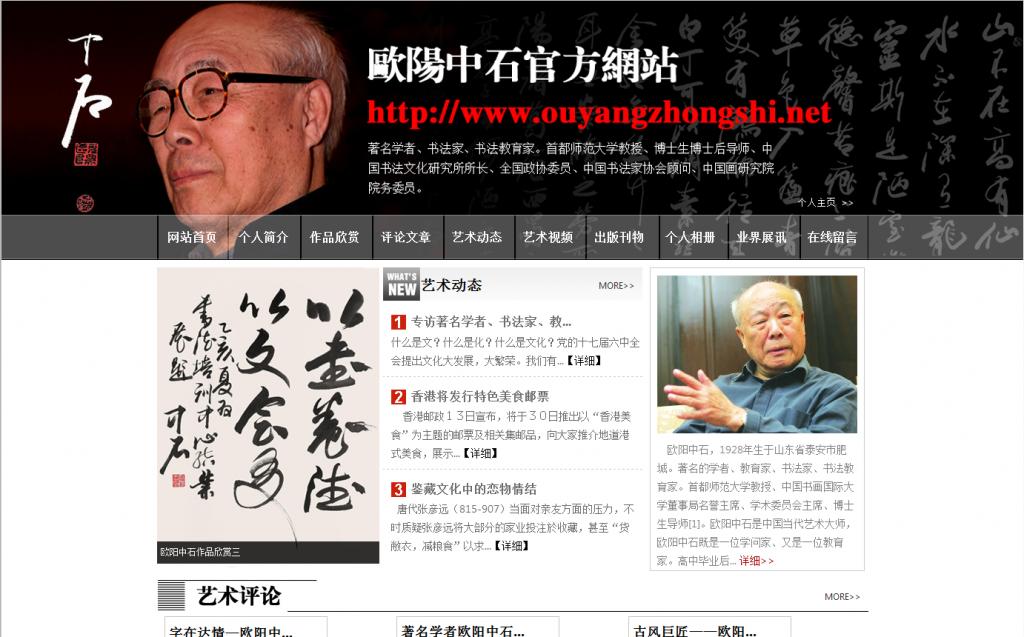歐陽中石06年獲第二屆“中國書法蘭亭獎——終身成就獎”。2007年榮獲中國文聯第六屆“造型表演藝術成就獎”“造型藝術成就獎”,是11位獲獎者中唯一的書法工作者?,F為中國書法家協會理事,北京書法家協會理事,齊白石藝術函授學院副院長,首都師范大學教授。藝術風格 歐陽中石的書法如其為人,格調清新高雅,沉著端莊,俊朗而又飄逸,古樸而又華美。觀他的作品,如欣賞高山流水,又如見萬馬奔騰,足見他無日不臨池的深厚功力和勇于創新的精神。他出版了《歐陽中石書沈鵬詩詞選》、《中石夜讀詞鈔》、《當代名家楷書譜·朱子家訓》、《中石鈔讀清照詞》、《老子〈道德經〉》等眾多作品集。其書法在國內外享有盛譽。個人傳記先后被載入山東大型當代歷史人物傳記畫冊《中華泰山兒女》、中國大型當代歷史人物傳記畫冊《中華齊魯兒女》系列叢書。歐陽中石博學多才,對中國傳統文化、藝術有較全面、精深的造詣。著述40余種,涉及國學、邏輯、戲曲、詩詞、音韻等。