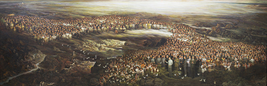 “乾坤萬里眼,時序百年心”,這是大詩人杜甫的名句,表現了遼遠的時空意識。時光遠逝,百年千年后,來者撫史慨嘆,記住了誰的音容笑貌?空間無限,所謂雁過留聲,是浮是沉?聲留何方?萬里眼中的乾坤,百年心間的時序,是風是雨?請讀畫家李書成耗時8年完成的史詩式巨幅油畫《中華頌-大世紀》。
