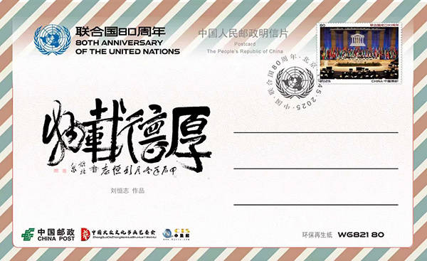 明信片正面呈現國禮藝術名家劉恒志的書法作品“厚德載物”,落款為“甲辰年冬月劉恒志書于北京”,體現中國傳統書法藝術與國際主題的融合。