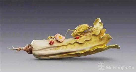 細細端詳,白菜葉莖上,還飾有兩朵小花,一朵含苞,一朵盛放;菜葉與主體的結合部位,趴伏著一只翠色蟈蟈,蟈蟈雙腿一屈一蹬,正盡情吮吸白菜鮮美的汁水;一只瓢蟲一旁靜臥,須角隱現,似乎也在埋頭享用大餐。小花和小蟲的點綴,使得整個作品兼顧野趣和雅致,充滿生命的律動與自然的和諧。