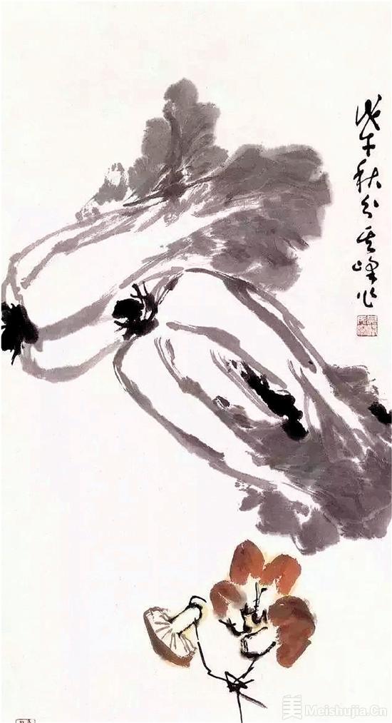 孫其峰(1920-2023),山東招遠人,中國近現代書畫家、美術教育家。孫其峰經常探求些不規則又富有變化的周秦風格的章法,從中體會貫通花鳥畫的構圖原理?!霸谖倚哪恐?,畫與印,微觀上有明顯區別,在宏觀上它們又是相通一致的?!?nbsp;孫其峰重視寫生與造型精準性,強調從自然中提煉形象。他筆下的白菜(左上圖),既有大寫意的豪邁粗放,又有著小寫意的精致內斂,水墨韻味濃郁,凸顯“不求形似,不離形似,貌離神合,似非而是”的寫意境界。
