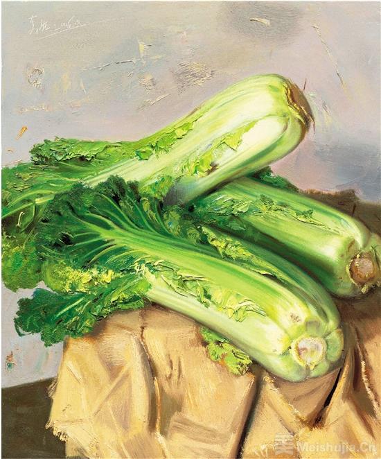 另外,它的顏色和質感很適合“練手”。白菜幫子潔白如玉,略帶透明;葉子部分從嫩黃到翠綠,色彩過渡非常微妙。畫家可以通過畫白菜,來學習如何調配白色、綠色和灰色,如何表現蔬菜上那種鮮活的水潤感。