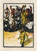 改革開放后,“抗戰精神”作為實現中華民族偉大復興的強大精神動力,正在為中國文藝思潮與藝術創作注入新的時代內涵。1982年,中國揭露日本文部省指定的中小學歷史教科書歪曲南京大屠殺的歷史,美化侵略行徑。出于強烈的使命感,程勉創作出《血寰——南京大屠殺木刻系列組畫》,直指戰爭對人性的摧殘與生命的踐踏。托爾斯泰曾說:“藝術不是技藝,它是藝術家體驗了的感情的傳達?!薄堆尽氛侨绱?,沒有直接渲染暴力,而是以情感為核心,用刀劈斧斫般的線條雕刻受難者扭曲的身軀、空洞的眼神、無力卻相依的群像,傳遞出幾乎令人窒息的悲愴。這組作品是對民族傷痛的銘記,是對人類和平的永恒祈愿,也是在新的時代背景下,對抗戰精神內核的一次深刻回望與紀念。