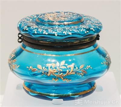 清代藍玻璃描金花蓋罐造型考究,紋飾精美,是清宮后妃生活用品,藏于沈陽故宮博物院。蓋頂部隆起,在寶藍色玻璃地上描金纏枝花卉紋,蓋罐上下口緣均鑲鎏金銅飾。罐腹部上下各飾描金弦紋,中間飾描金花卉紋,盤形托邊緣亦描金一周。