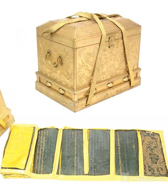 此冊為清乾隆元年(1736)清宮內府遵旨鐫刻而成,冊文詳細記述了清太祖皇帝一生功德、業績及其廟號、謚號等。謚冊首頁、末頁各鐫刻填金云龍紋,其余八頁淺刻陰文滿、漢楷書文字,其中左五頁為滿文,右三頁為漢文,冊文填青,謚號填金。各頁玉板用黃緞制套聯綴成冊,每頁之間以明黃織錦墊相隔;冊外為明黃纏枝蓮紋織錦包袱皮,以黃絲帶捆系,再用雙層云龍紋金漆套盒盛裝。該冊于乾隆四十八年(1783)由北京送至盛京(今沈陽)太廟尊藏,清末民國時期存于沈陽故宮崇謨閣內。