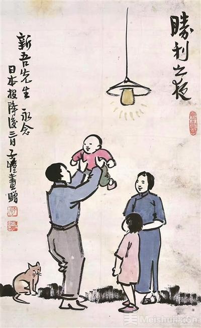 1945年8月10日,當電臺里傳來日本接受《波茨坦公告》全面無條件投降的消息時,重慶的大街小巷人們奔走相告,慶祝勝利的鞭炮聲此起彼伏。當時避居山城的豐子愷,有感于此,繪制了《卅四年八月十日之夜》——父親喜不自禁,將孩子高高舉過頭頂,象征光明和勝利的燈光照亮畫面。豐子愷通過一個家庭的溫暖瞬間,描繪了抗戰勝利之夜的人民心聲。隨之,豐子愷在此基礎上再繪《勝利之夜》,畫面中的紫衣男孩換作笑容溫婉的母親。9月2日,日本代表在美軍“密蘇里”號軍艦簽署無條件投降書,豐子愷即作《炮彈作花瓶