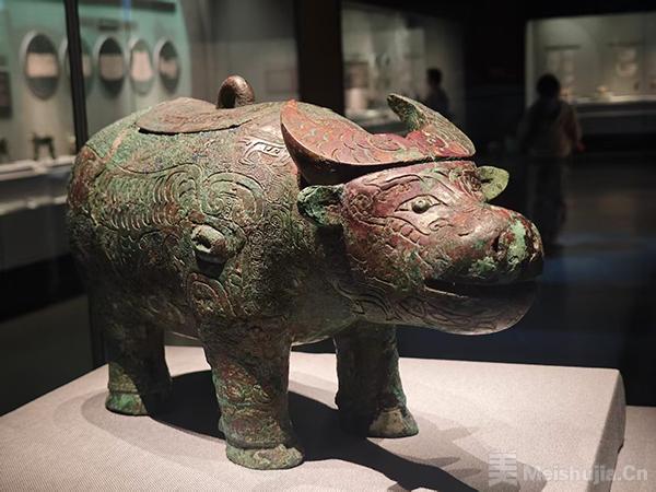 牛面部鑄銘文“亞長”,亞長是商王朝南部“長”國的部落首領。這件青銅尊仿水牛制成,栩栩如生的造型體現出工匠對水牛特征把握的精準,也是當時殷墟氣候的直接反映。更為重要的是,通體遍飾神性動物紋樣的牛尊,不僅是一件祭禮的酒器,更是殷商時期人神溝通的媒介,擔負著溝通天地的神圣職責。