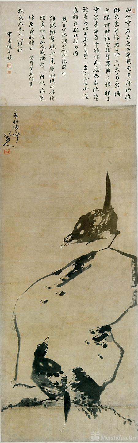 展覽的終章,回溯至源頭:“青藤雪個”。徐渭與八大山人,一狂放一孤冷,共同奠定了大寫意繪畫最為關鍵的精神內核——直抒胸臆、不拘形跡,將強烈的個體生命體驗轉化為不可復制的筆墨形式。徐渭深得晚明浪漫主義思潮滋養,其《三江夜歸詩》墨跡縱橫跌宕,洶涌澎湃的錢塘江猶如徐渭的人生際遇,怒潮奔流,滿腔悲憤躍然紙上,我們恍然瞥見一位不羈文士,“筆底明珠無處賣”,只得將自己的半生血淚與藝術狂想獻給這滾滾江潮。八大山人則走向另一極致。其筆下花鳥禽魚充滿象征與隱喻,冷逸孤峭的畫面深處,是強烈的現實關切與超越的禪學哲思?!澳c無多淚點多”,八大山人的藝術是高度象征的,他將巨大的情感力量凝結于最精簡的筆墨之中。