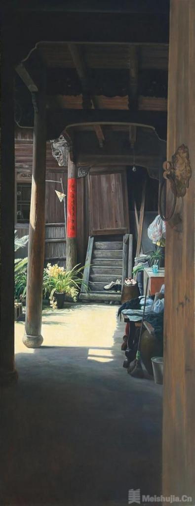 古人對太陽的雅稱叫扶光,太美了,扶著光,就是要抓住這光。老單早些時候畫了一批老家農村里的房子,畫室內場景,總有一束光照在灶臺上、桌子上,一些毫不起眼的物件上。這種處理方式具有維米爾式的古典油畫精神,光線的聚焦點是一幅作品的畫眼,傳達出作者的用意,為什么要照向平凡的物象,為什么暗暗的房間里要有光,我想是這樣的,背陰向陽,追求光明,這束光在他的眼里是來自圣域的光,在它的照耀下,一切平凡的事物仿佛都有了神性。