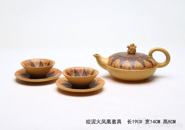 據吳立軍介紹:《火鳳套具》由一壺、二杯,二碟五件套組成。壺身由絞泥制作的方法組合成鳳凰的羽毛狀,工藝復雜,絞泥用的是三種原礦黃金段、民國綠、和清水泥疊加在一起,每片羽毛5O層左右,每種泥料要算好收縮率,不然容易開裂,口蓋是開蓋做蓋,鎖蓋定羽毛紋路,嚴絲合縫,這樣可以做到整體美觀。杯和碟圖案,羽毛是做在里面的,排列也是整齊美觀?!痘瘌P套具》既有觀賞性又有實用性,收藏也具有價值。