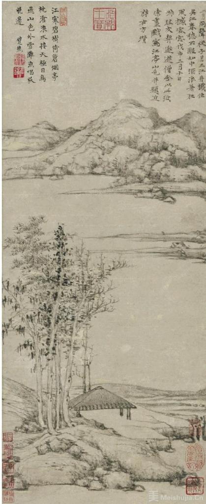 此作畫于“戊申(1368年)三月十日”,因友人邀游僧舍以紙索畫,遂有此作。題識為:“二月雨聲從子月,三江舟檝住吳江。春愁不醒如中酒,浪著狂風撼客窗。戊申(1368年)三月十日叔珪友契邀游僧舍,以此紙索畫。戲寫江亭山色并題近詩右方,瓚?!?