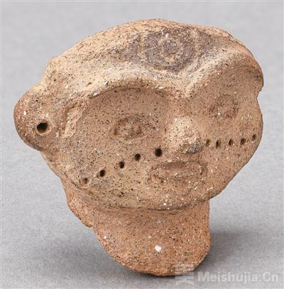 陶塑雕題紋面人頭像是蚌埠市博物館“鎮館之寶”之一,出土于蚌埠市淮上區小蚌埠鎮雙墩村。此器由陶土經手工捏制后燒制而成,高6.3厘米,寬6.5厘米,由于陶土中摻入了云母粉末,表面泛著點點光澤。頭像眉弓突出,雙目圓睜,直視前方,鼻子扁平微翹,小嘴張開,左耳殘,右耳有一穿孔,五官比例恰當,凹凸對比適度,呈現出一個美麗少女的形象,被稱為“七千年前的微笑”。左右臉頰各有5個戳刺圓點連成一線的斜紋,額頭正中間有2個同心圓,專家認為可能象征著遠古先民對太陽的崇拜。博物館講解員謝夢波介紹,雕題、紋面是反映先民審美和信仰的習俗,即用特定的方式在人的面部刺出花紋圖案,刺在額頭上為雕題,刺在面頰上為紋面。這件陶塑人頭像是國內目前已知的雕題紋面的最早實物例證,為研究原始藝術和原始信仰提供了寶貴的實物資料。
