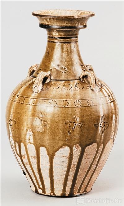 壽州窯是隋唐時期制瓷名窯,窯址分布在今淮南、鳳陽、蚌埠等地。館藏一級文物壽州窯青釉印花四系盤口瓷壺,口徑12厘米,底徑11.8厘米,高35厘米。盤口,長頸,鼓腹下斂,平底。肩部有4個橋形豎紐,壺身有4層模印草葉紋。通體施青釉至下腹部,釉色透明,并有細小開片,腹下流釉20多處,渾然天成,十分美觀。此壺制作考究,堪稱隋代壽州窯產品的巔峰之作。