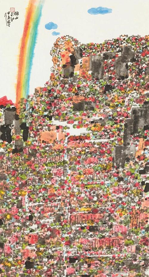 傳統山水畫以“三遠法”構建三維空間,而林天行則轉向“平面化”“飽滿化”的構圖,以鳥瞰視角重構世界,讓畫面充滿現代都市的幾何美感與節奏張力。在《景象香港》系列中,這種構圖尤為明顯:《新界晴雨》采用放射式構成,從高空俯瞰香港的山與海,潑墨的色塊如云層翻滾,街燈的線條如琴弦縱橫,魚群似在空中跳躍,房屋似在傾聽海浪,所有元素在平面上共生,卻因色彩的層次生出空間縱深感;《碼頭》描繪繁忙的香港碼頭,“燈火輝煌,水天一色,富強烈節奏的線條穿插其間”,傳統留白被填滿,取而代之的是都市的擁擠與活力,恰如香港“寸土寸金”的城市特質。何佳霖在《一半天宮》中評價林天行的構圖“線與線的關系,物體與物體的互相制約,和諧且富有個性”。他的畫面極少留白,卻不顯雜亂,秘訣在于“取舍與重組”——他會解構傳統山水的形態,提取自然與都市中的核心元素,再以抽象的邏輯重新排列。如《獅山云涌》中,云被披上金色,與獅子山融成一片,“稠密與稀疏相間有序”,每一朵云都是“一次回眸與駐足”,既象征香港的凝聚力,又暗含“獅子山精神”的堅韌。這種構圖,既是對現代都市“縱橫交錯”視覺體驗的回應,也是對中國傳統“散點透視”的創新——不局限于單一視角,而是將不同時間、空間的景象壓縮于一畫,形成超現實的“意象空間”。