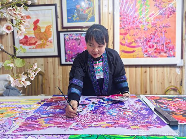 從縣里的普及班到市里的提高班,再到自治區乃至全國的培訓班,陳美美像海綿般不斷汲取養分,并勇于探索藝術融合,為三江農民畫注入新鮮活力。這份努力也帶來豐厚的回報:她的作品入選全國美術作品展覽、首屆中國鄉土繪畫(農民畫)作品展、中國農民畫優秀作品雙年展等全國重要展會。