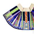 多色緞地繡庭院仕女綴花卉紋月華馬面裙 ??馬面裙是中國傳統服飾中極具代表性的裙裝,其歷史悠久,外形獨特,工藝精湛,凝結了美用一體、以文載道的人文思想。馬面裙的形制定型于明代,由裙腰及兩片長方形裙身構成,每片裙身左右兩側各有一個光面,稱為“裙門”。穿著時,裙門兩兩重合,形成里外搭疊的形態。 ??清代是馬面裙發展的繁盛期,裙型有闌干、月華、鳳尾、百褶魚鱗等多種式樣,且極重視前后馬面部分的裝飾。裙身多以刺繡